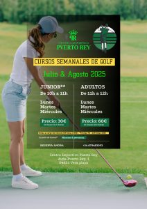 Abiertas las inscripciones a los cursos de golf de verano 2025 en Centro Deportivo Puerto Rey en Vera playa. La oportunidad perfecta para dar un empujón a tu golf o para iniciarte en este deporte. El curso es semanal de lunes a miércoles con clase de 60 minutos cada día. Puedes elegir una o varias semanas desde el 1 de julio hasta el 27 de agosto. Nivel iniciación. Grupos de 8 alumnos máximo. El precio es por semana 30€ para grupo junior (a partir de 6 años) y 60€ para grupo adultos.